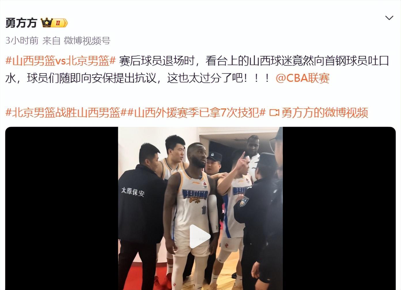 面对缺少周琦、赵睿、曾凡博、斯佩尔曼多位主力的残阵北京,拥有天时人和地利,山西却还是输给了阵容比他们更加残缺的北京,吃下3连败,山西球迷气急败坏,再次做出不冷静举动,媒体人勇方方爆料,赛后山西看台有人向北京球员吐口水(估计山西又要被CBA追加处罚了)。