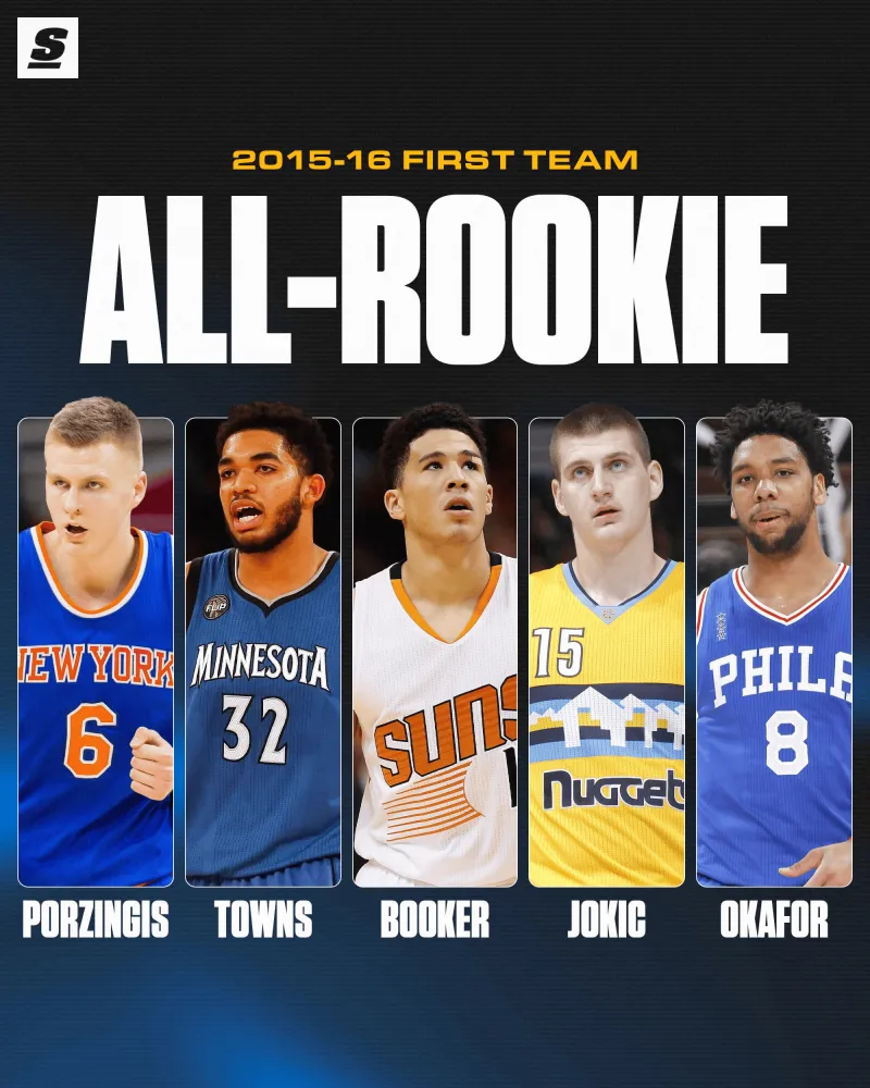 2015-16赛季的最佳新秀一阵为:波尔津吉斯、唐斯、布克、约基奇、奥卡福;